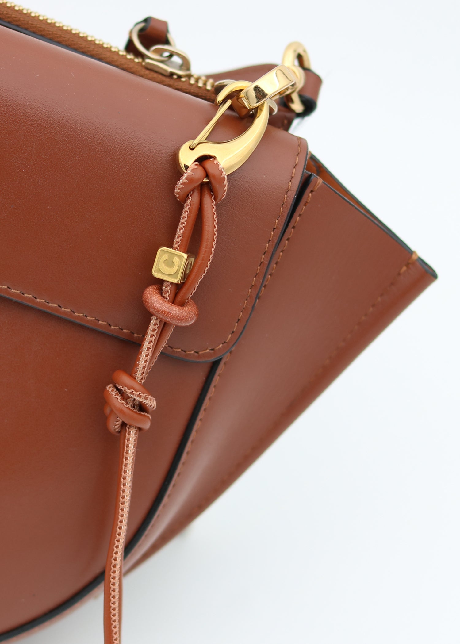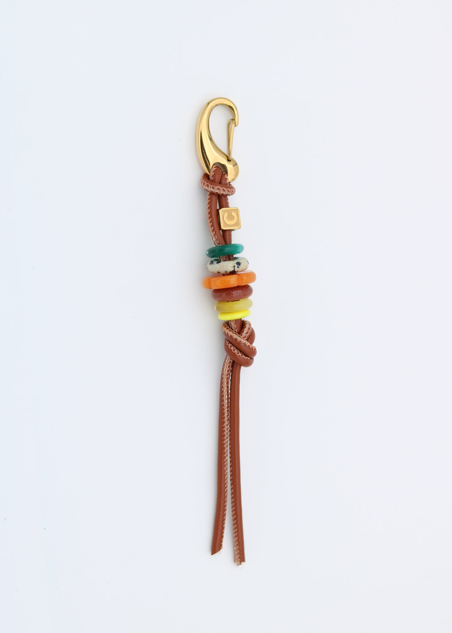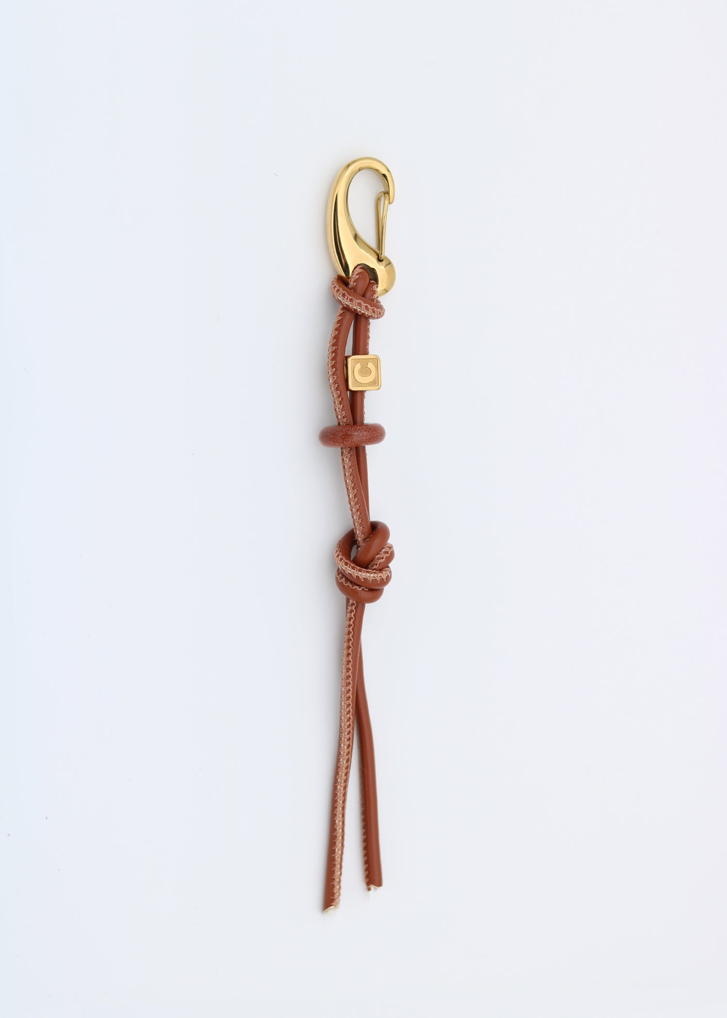This simple Bag Charm is the ideal base for creating a personalized accessory. It features a water-resistant, gold-plated stainless steel carabiner clasp to easily click on, a knotted brown PU leather cord, a customizable gold-plated stainless steel initial dice, and a medium-sized charm. Easily add charms from our collections to customize it and perfectly complement your style and favorite bags.