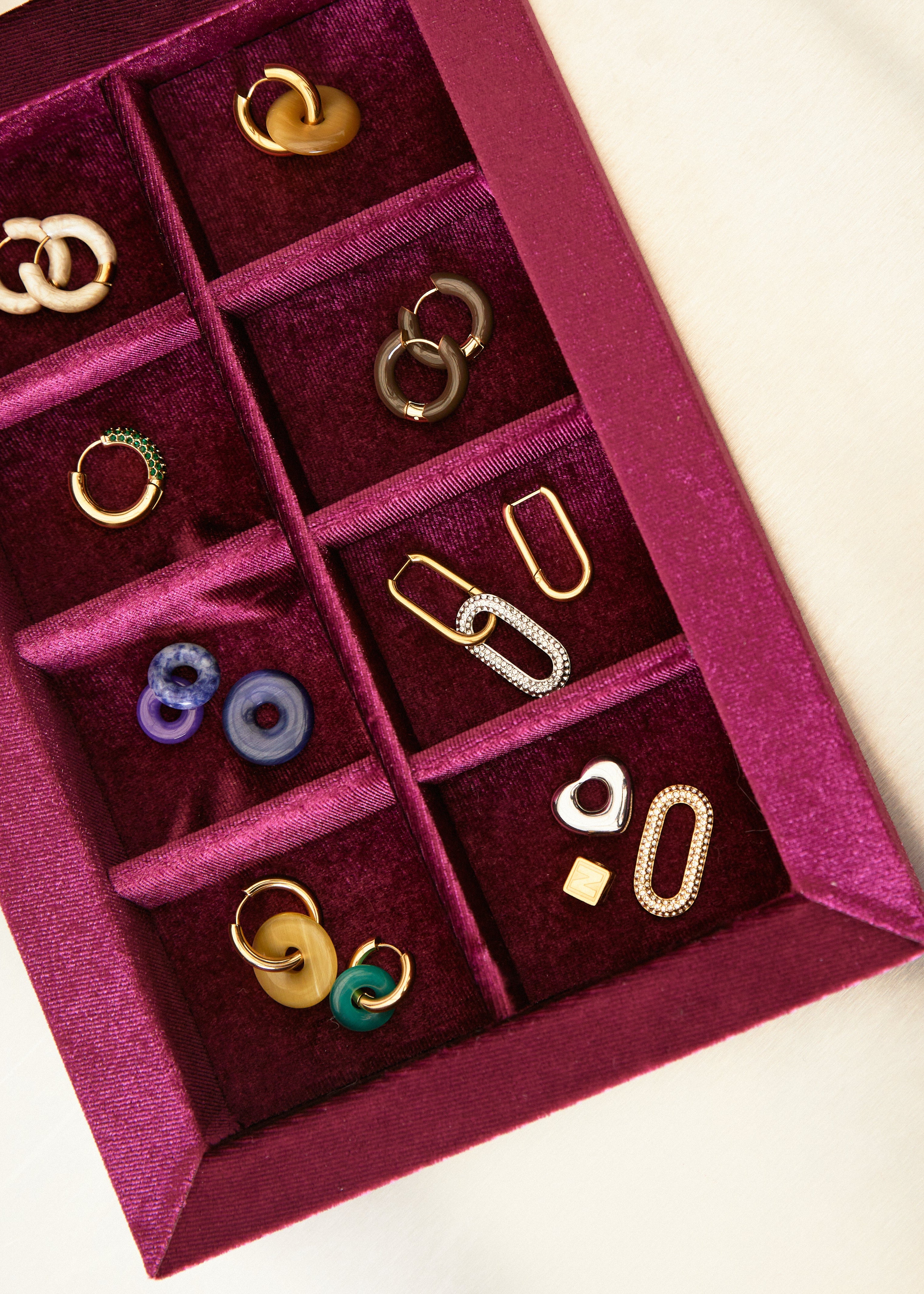 Give your jewelry the VIP treatment it deserves with this gorgeous small bordeaux velvet tray! Built with a solid wooden base and wrapped in velvet, it's packed with clever compartments that keep your sparkly collection in perfect order. Whether you're a serious collector or just love showing off your favorite pieces, this charming organizer makes storing your gems feel like pure pleasure.