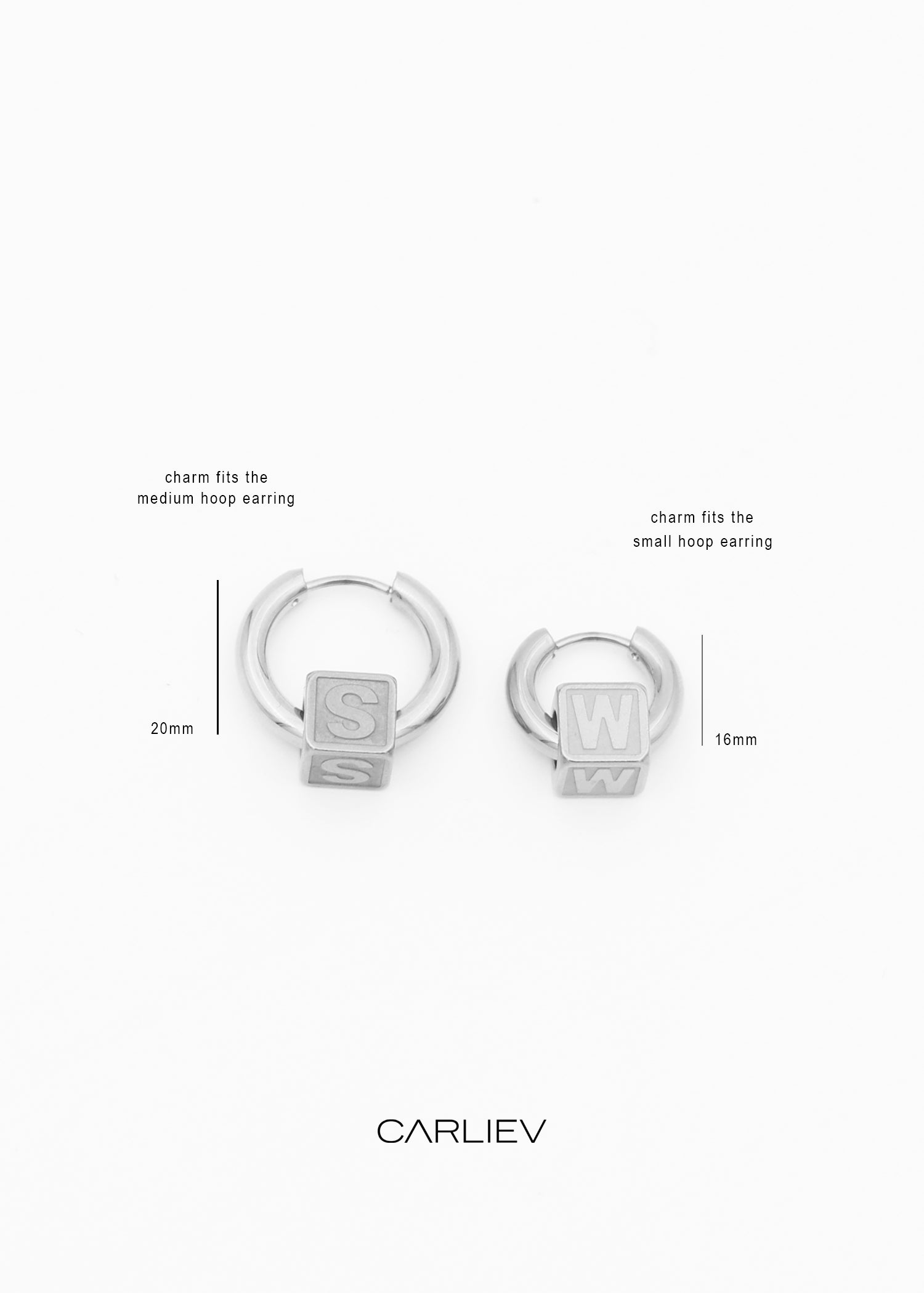 This Initial Dice is a versatile accessory designed to enhance your style. Crafted from durable water-resistant stainless steel with a silver-plated finish. Perfect to wear on a necklace chain, attach to a bagcharm, or pair with hoop earrings, it adds a personal touch wherever you choose to wear it.