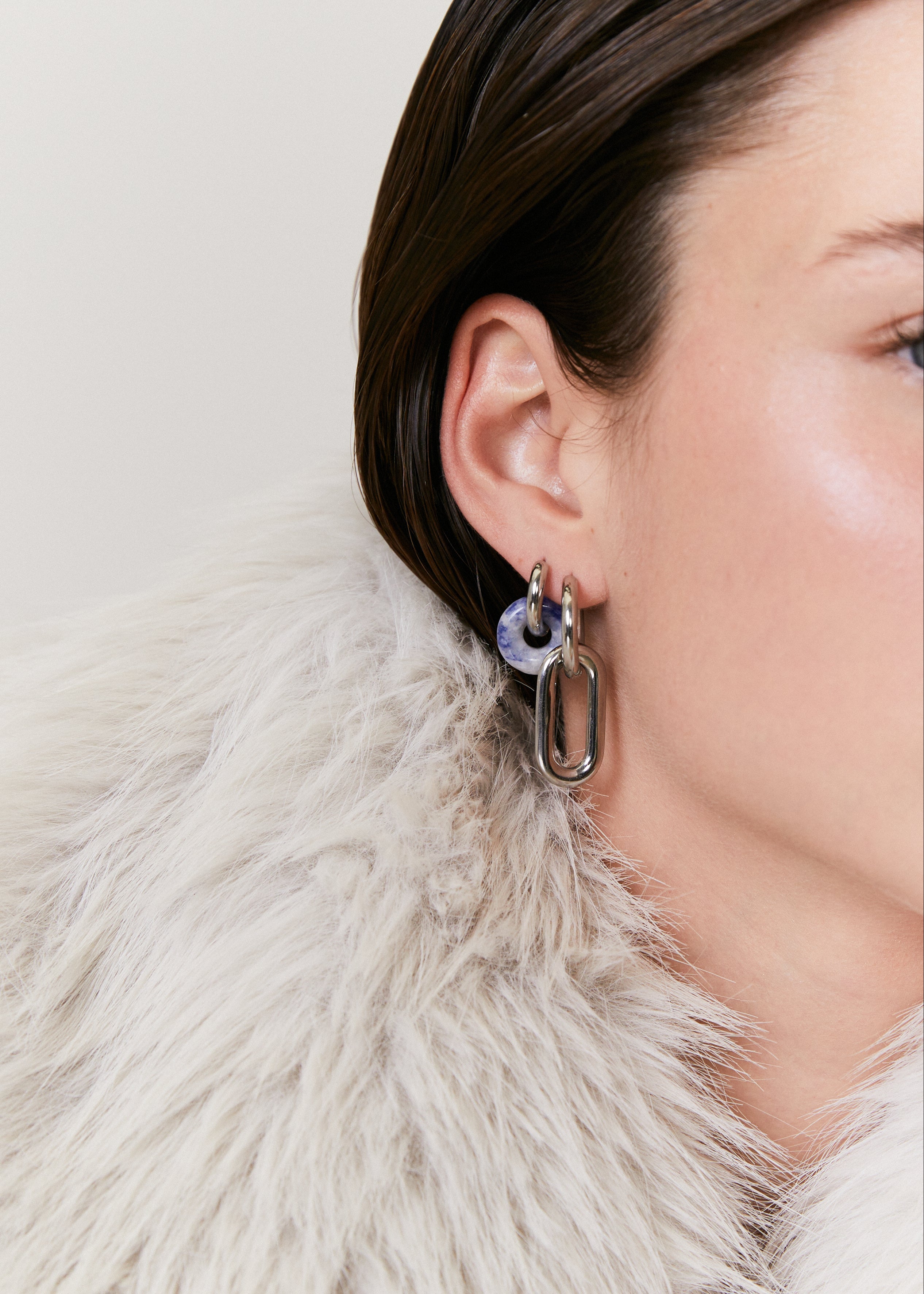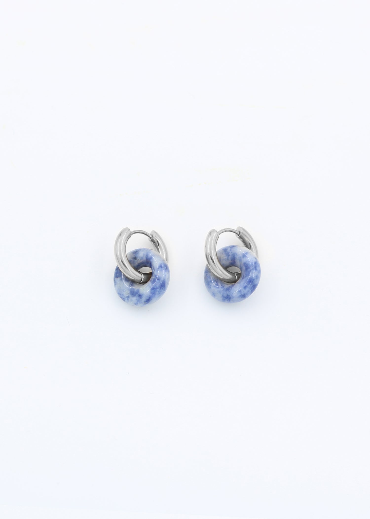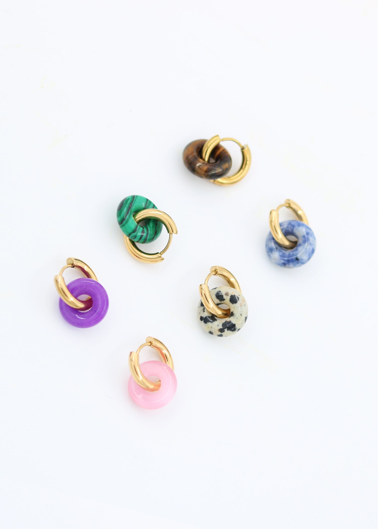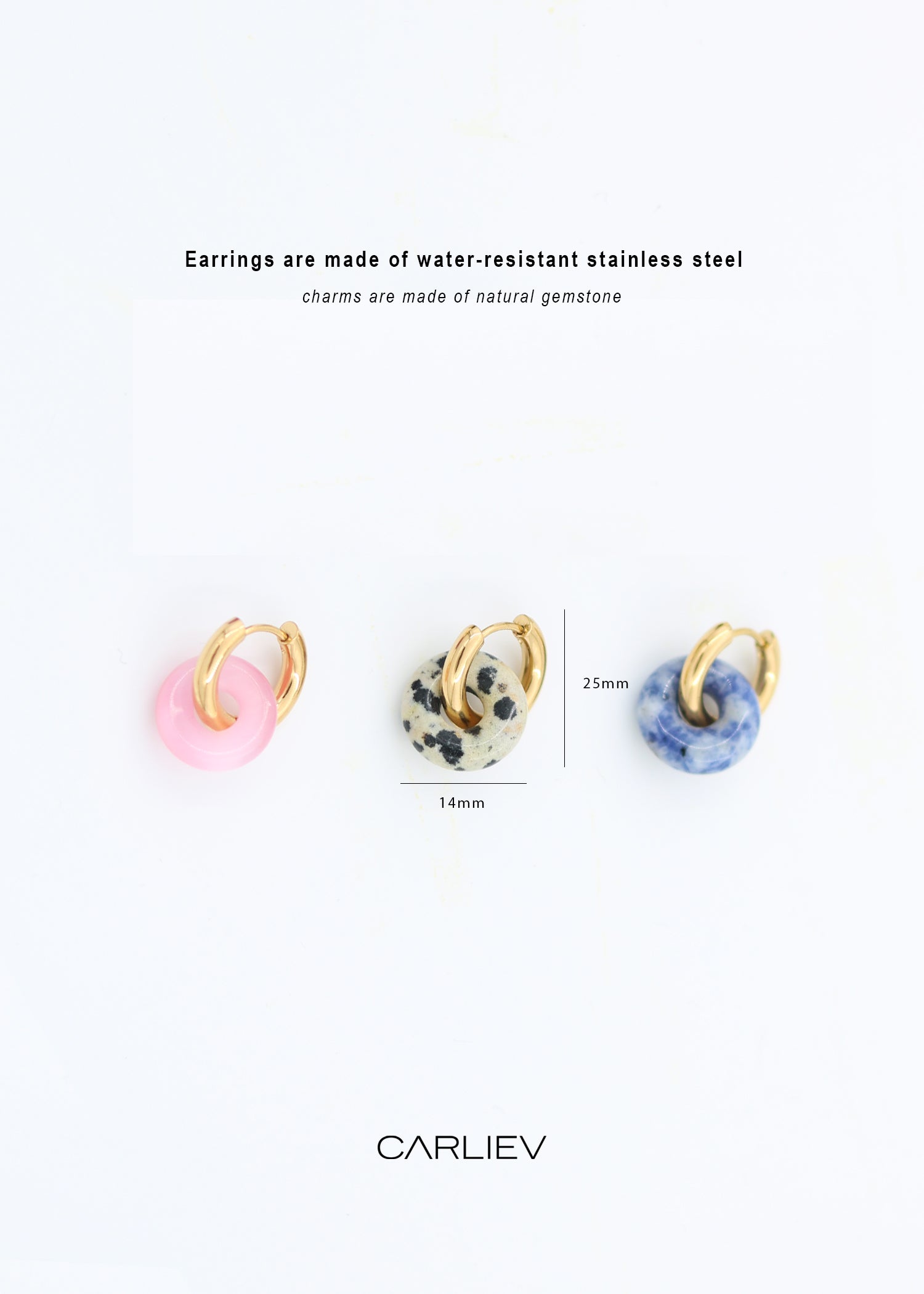 Set of stylish waterproof gold-plated hoop earrings in small size, combined with donut shaped charms made of natural gemstone.