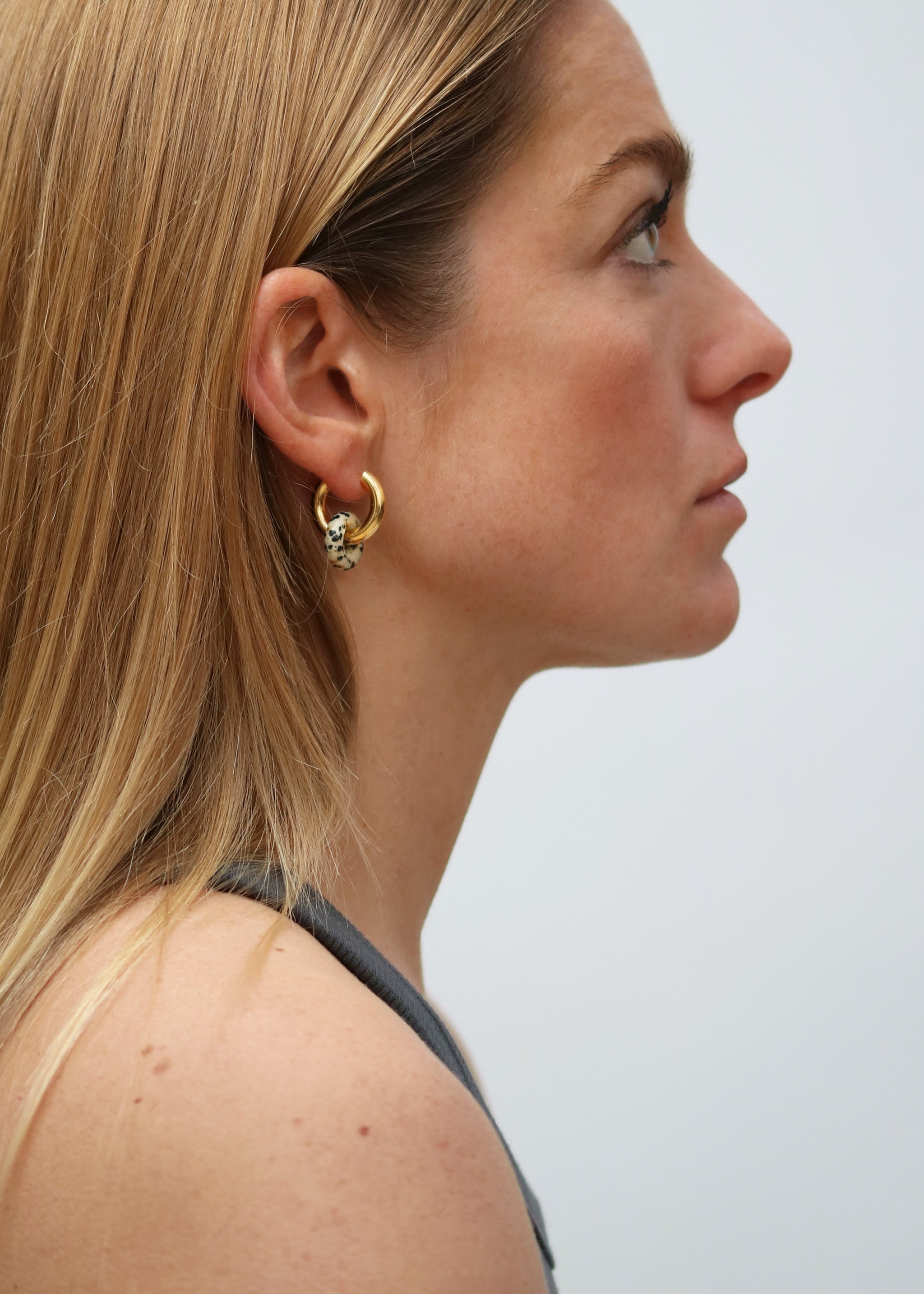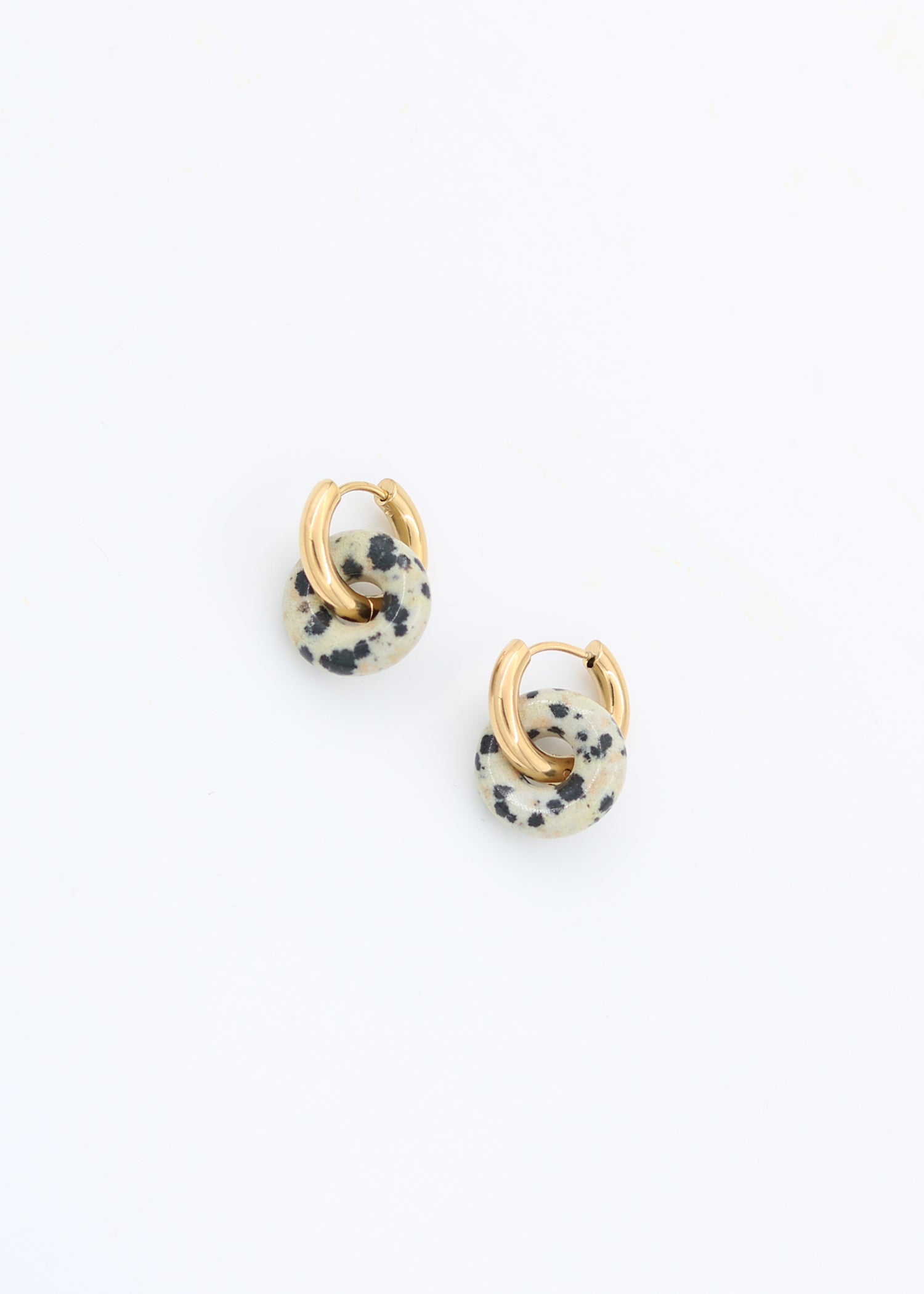 Set of stylish waterproof gold-plated hoop earrings in small size, combined with donut shaped charms made of natural gemstone.