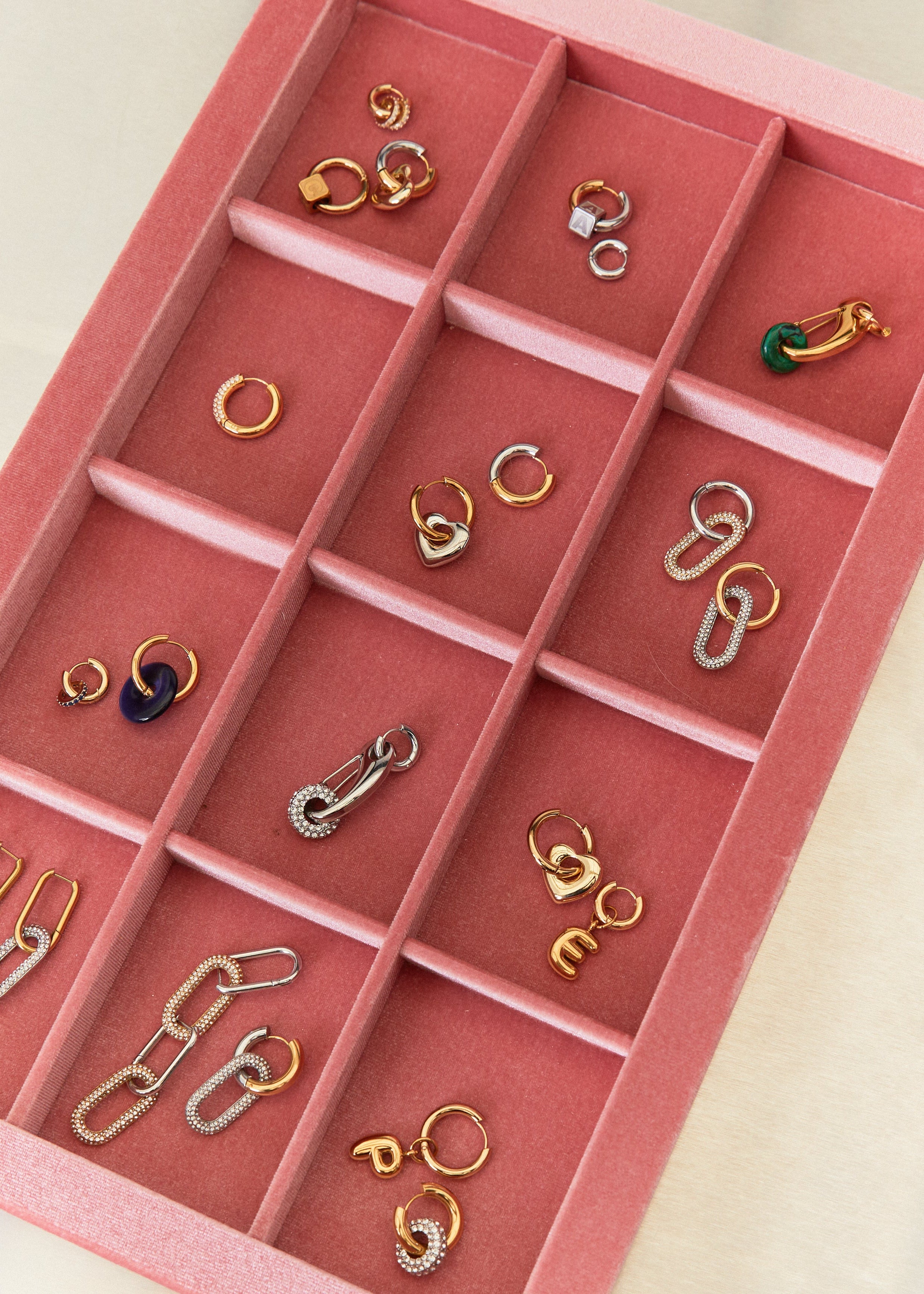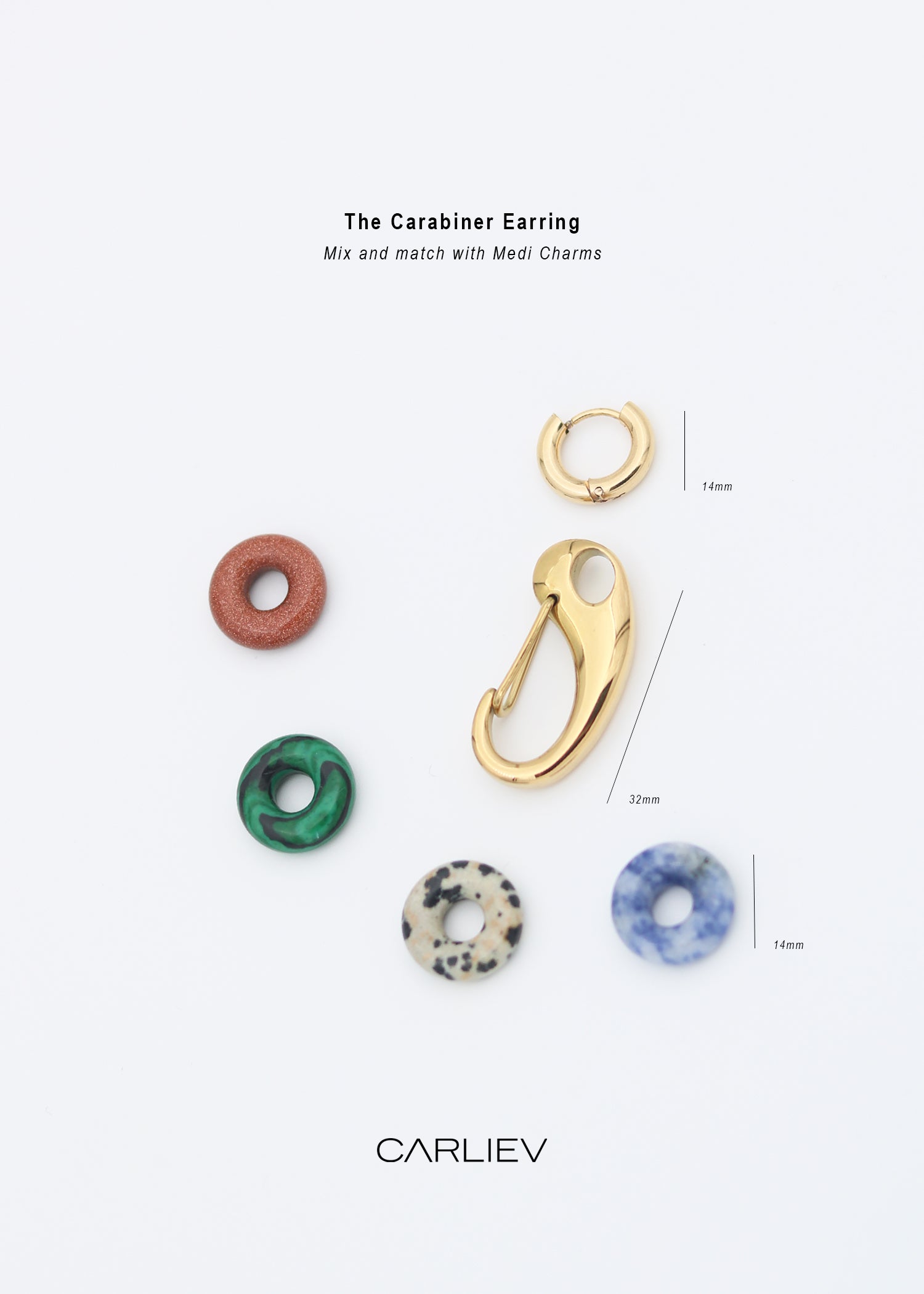 Carabiner Gold Hoop Earrings are made of water-resistant stainless steel. They are the perfect base for mixing and matching with Medi Charms in all colors. You can wear them in multiple ways, and also wear the mini Hoops seperately without the Carabiner or with a different charm. With these classic favorites, you can build a personalized earparty that will remain timeless and stylish.